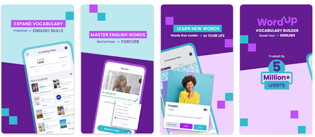 - اپلیکیشن WordUp یکی از پرطرفدارترین برنامههای گوگلپلی و اپاستور برای یادگیری واژههای انگلیسی است و از امتیاز بسیار بالایی برخوردار است. این برنامه علاوهبر زبان انگلیسی از زبانهای دیگری مثل زبان آلمانی، فرانسوی، اسپانیایی، چینی و... پشتیبانی میکند و هر فرد با کمک زبان مادری خود قادر است به یادگیری زبان بپردازد.