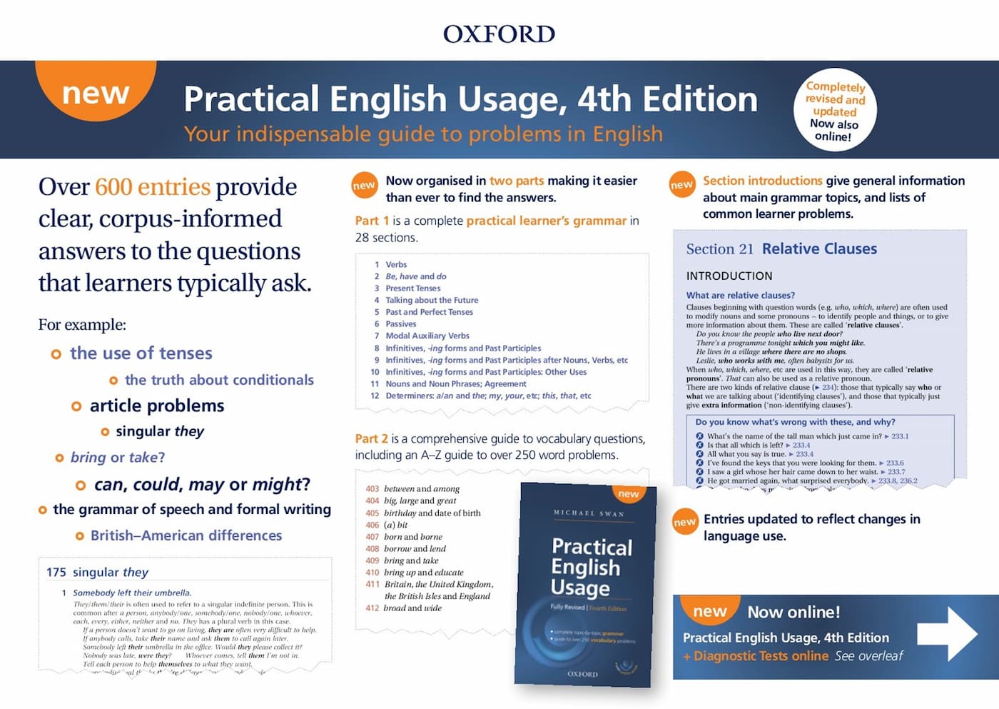 کتاب Practical English Usage یکی از منابع قوی و کامل برای آموزش گرامر انگلیسی شناخته میشود و با استفاده از آن میتوان دانش گرامری خود را ارتقا داد. علاوهبر آموزش این مبحث، در این کتاب به مفهوم واژهها، شکل نوشتاری و تلفظی لغات انگلیسی نیز پرداخته میشود.